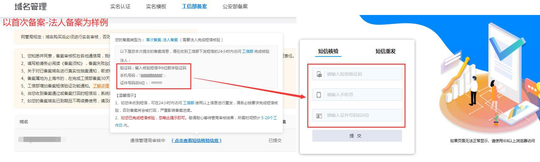 根据工信部要求,自2020年8月17日起,中国内地(大陆)提供服务的网站进行备案时需进行短信核验,您提交备案申请通过接入商审核后,会收到工信部发送的核验短信,您需要在收到短信的24小时内完成短信核验,备案申请才能进入管局审核。